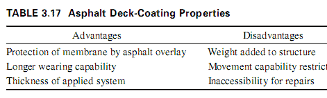 Asphalt severely restricts the capability of the waterproof membrane coating to bridge cracks or to adjust to thermal movement. Additionally, it is difficult to repair the waterproofing membrane layers once the asphalt is installed. There is no way to remove overlays without destroying the base coat membrane. Asphaltic systems are not recoatable. For maintenance, they must be completely removed and reinstalled. (See Table 3.17.)