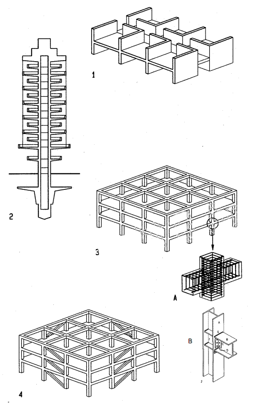 A Concrete moment resistant joint Column re-bars penetrate beam and beam re-bars penetrate column) B Steel moment resistant joint (stiffener plates between column flanges resist beam flange stress)